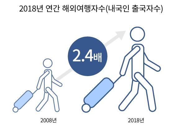 지난해 우리나라 연간 여행자(출국자) 수는 2,869만 6,000명 달했다고 합니다. 10년 전인 2008년에 비해 해외여행자 수가 2.4배 늘어난 것입니다. 인구 대비 해외여행자(출국자) 비중은 지난해 55.6%를 기록했고, 평균 해외여행 횟수는 2.8회였습니다. 이런 추세라면 올해 해외여행자는 3천만 명을 넘길 것으로 보입니다. 출처 : 한국 관광통계(한국관광공사 발표)