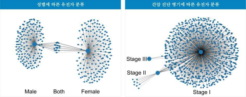 - 간암과 관련된 많은 실험이 수많은 연구 기록을 지식화한 바이오 지식 그래프통해서 유전자환자 성별간암 진단 병기에 따라 분류비교