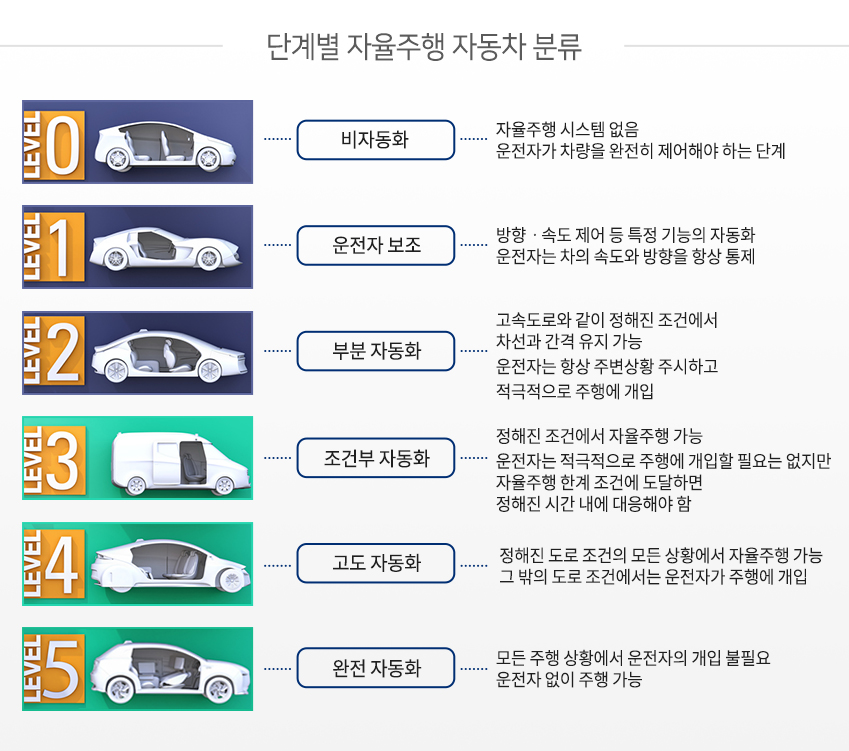 자율주행 기술의 6단계 4차 산업혁명에서 핵심 분야로 떠오르는 자율주행차는 문재인 정부의 주요 공약으로 제시되며 정책적인 지원이 활발한 분야입니다. 특히, 지난주(7월 14일)에는 다양한 디