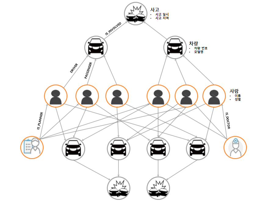 가피 공모 보험 사기에 해당하는 그래프 패턴을 찾기 위해서는 의심 사고에 대한 탐색이 먼저 필요하다. 또, 공모 사기단 간에 공유하고 있는 지인들이나 보험설계사, 의사와의 추가적인 관계가 있을 수 있음으로 사고와 연관된 추가적인 관계들을 탐색해야 한다. 공통된 관계를 확인했다면 이들은 주요 인물로 관리한다.