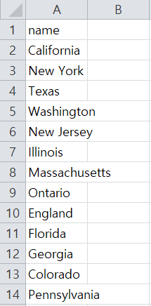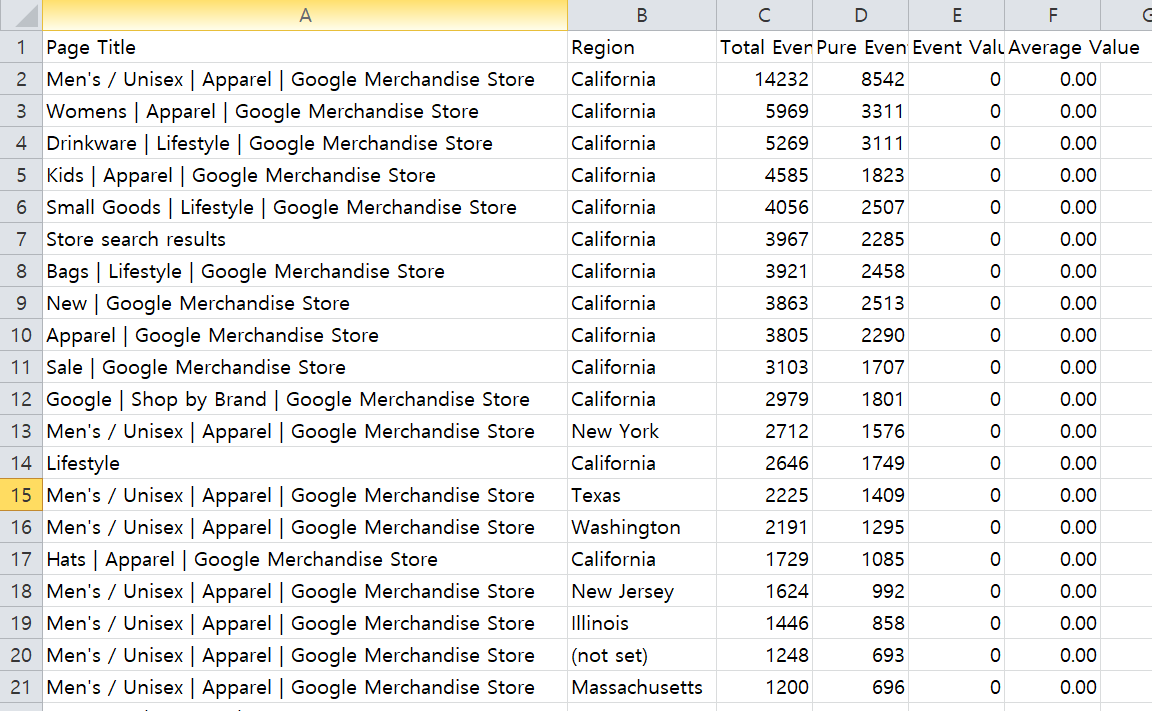 CSV 파일을 만드는 방법을 보여주기 위해 구글 애널리틱스(Google Analytics)에서 수집한 데모 샘플 데이터를 준비했습니다. 이 데이터는 특정 기간 동안 특정 상품 매장 웹사이트를 방문한 전 세계의 주요 주와 도시에 대한 데이터가 기록되어 있습니다.