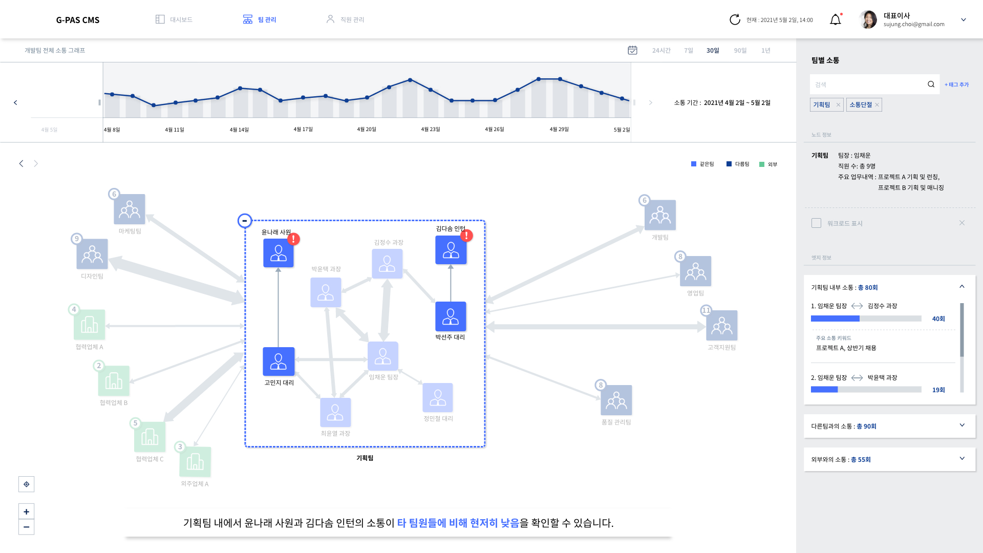 HR업무를 지원하는 G-PAS CMS를 도입한다면, 직원과 소통이 적은 임직원, 관리자와 직원 관계 이상, 또는 퇴사 시 조직에 부정적 영향을 끼치는 핵심 직원을 탐지하여 기업의 생산성 저하 문제를 해결할 수 있을 것입니다. 또, 궁극적으로는 숨겨진 비즈니스 가치를 발견해 더 큰 가치 창출의 기회로 활용할 수도 있을 것입니다.