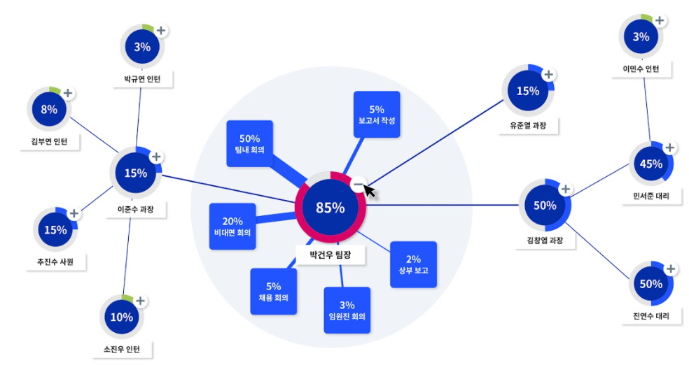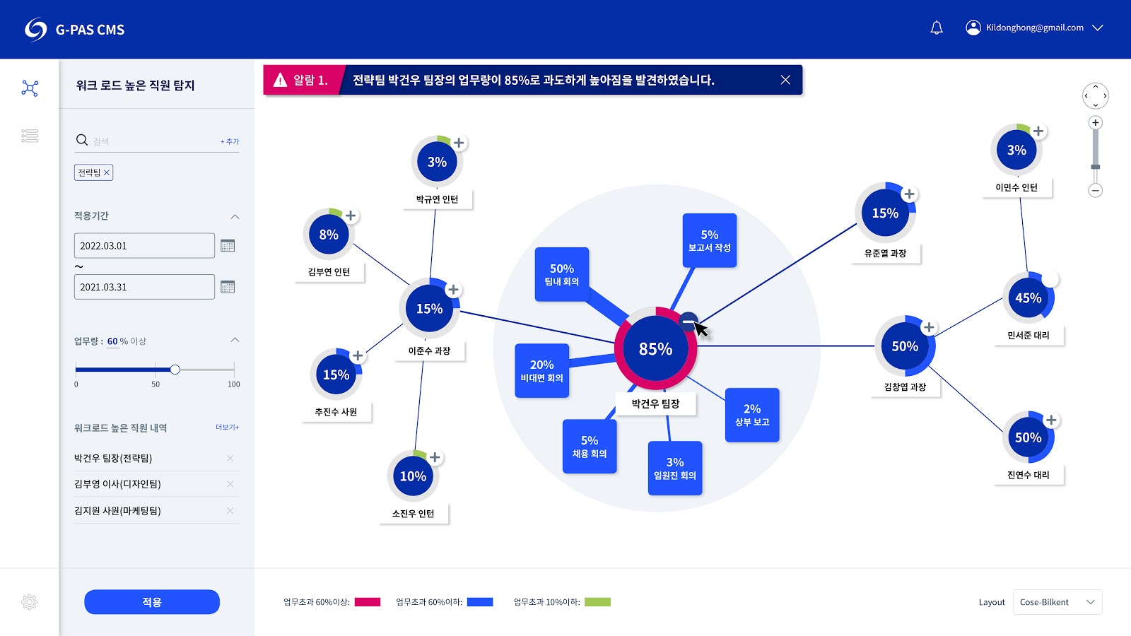 G-PAS CMS는 업무량에 대한 비율을 조정하여, 워크로드가 높은 직원을 검색할 수 있으며, 해당 직원이 어떤 업무로 인해 작업량이 높은지 상세하게 알 수 있습니다.