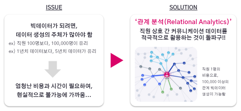 직원 1명당 생성하는 데이터가 많고 객관적 지표가 되는 ‘커뮤니케이션 데이터’를 수집하는 것이야말로 빅데이터를 구성하는데 유리할 수 있습니다. 커뮤니케이션 데이터의 관계 분석을 하면, 회사 안팎으로 발생하는 임직원 개인과 조직 간의 의사소통 내용을 분석하여 변화하는 노동환경에 대응할 수 있고, 객관적인 성과관리, 일하는 방식의 개선 및 인재 확보에 활용할 수 있습니다.