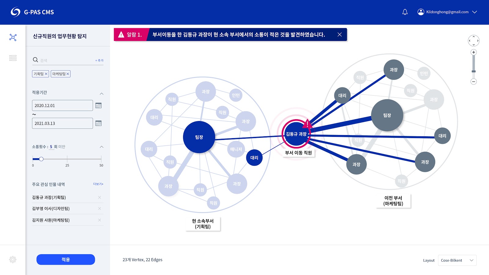 G-PAS CMS는 그래프 군집기법(Graph Clustering Alogrithm)을 통해 조직 내 업무융화도를 분석하여 신규입사자 혹은 신규조직발령이 된 직원의 현업과 이전업무 현황을 비교하고, 신규 조직에 적응을 잘하고 있는지에 대해 탐지가 가능합니다.