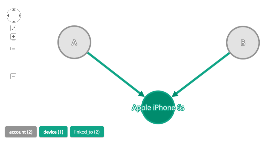 계좌 ‘A’는 이미 2019년에 금융사기로 적발되었던 계좌다. 계좌 ‘A’ 기준으로 device기기를 공유한 사건이 있는지 패턴 조회를 할 수 있다. 패턴 조회 결과, 계좌 ‘A’와 계좌 ‘B’는 ‘Apple iPhone 6s’의 기기를 공유하고 있음을 발견할 수 있다.