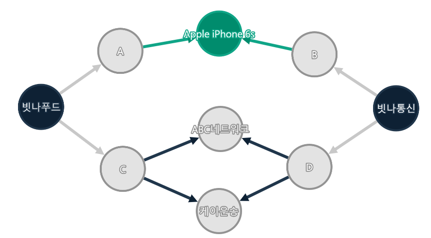 금융사기로 적발된 계좌 ‘A’는 법인 ‘빗나푸드’를 통해 생성되었으며, ‘빗나푸드’를 통해 생성된 계좌들은 대포통장인 것은 쉽게 알 수 있다. 이에, ‘빗나푸드’에서 생성된 대포통장을 기준으로 대포통장 간의 의심 거래처를 공유하는 패턴을 찾아볼 것이다.