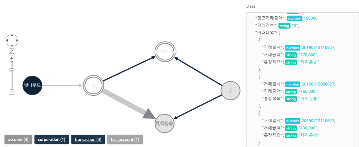 D. 법인, 계좌, 송금내역, 접속정보 등을 연결한 그래프 모델을 구축하고 그래프 쿼리를 통해 의심 계좌와 연관 관계를 탐지할 수 있다.