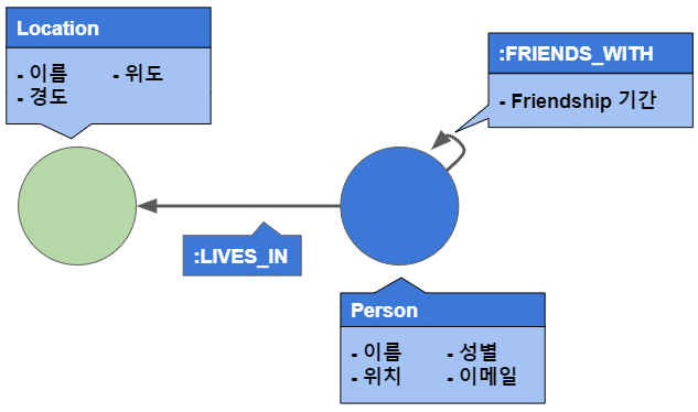 위 소셜 네트워크 그래프에서 모든 사람은 Person이라는 레이블이 지정된 노드로 표시됩니다. 이러한 노드에는 이름, 성별, 위치 및 이메일과 같은 속성을 포함합니다. 해당 네트워크에 있는 사람들 간의 관계는 FRIENDS_WITH로 지정되며 친구를 맺은 기간은 Friendship 기간 속성에 포함합니다. Person은 Location 레이블이 지정된 노드의 :LIVES_IN 관계를 통해 연결되어 있습니다. 그래프 DB는 이러한 데이터간 연관관계를 통해 의미있는 인사이트, 즉 ‘가치’를 뽑아낼 수 있다는 특성이 있습니다.