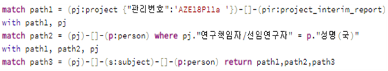 Cypher는 프로퍼티 그래프의 효율적인 질의 및 업데이트를 허용하는 그래프 질의어이다. “MATCH (P:참여자)-[]-(o:기관) return” 등의 패턴 질의문은 일부 중간 관계를 모르거나 삭제되어도 쉽게 찾을 수 있고, 질의어가 변경되지 않는다. 그래프 DB의 질의문이 간단한 만큼 찾고자 하는 것만 알면 데이터 조회가 쉬워진다.