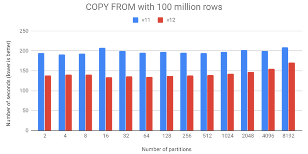 데이터 1억 건 이상을 적재할 때 PostgreSQL 12의 속도가 PostgreSQL 11보다 우위에 있습니다. 위 이미지는 걸리는 시간이 적을수록 데이터 적재 속도가 빠르다는 것을 보여주고 있습니다.