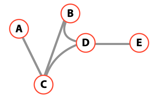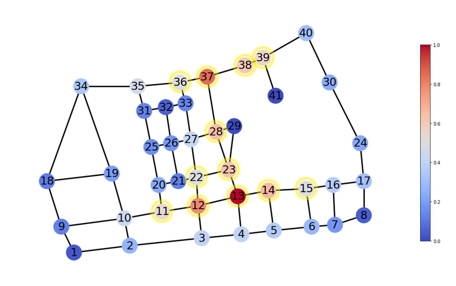 위의 두 조건을 적용한 지역의 통행 상황을 그래프화 하기 위해 교차로를 노드(점), 도로를 엣지(점 간의 연결선)로 구성하였다. 간단한 모델 구성을 위해 방향성이 없는 그래프를 사용하였으며 각 도로의 최대 통행량을 설정하였다. 그리고 통행에 대한 집중도 지표를 제공하기 위해 그래프 이론에서 널리 쓰이는 betweenness centrality (B.C)를 사용하였다. B.C는 임의의 서로 다른 두 노드 간의 최단 거리 위에 해당 노드가 얼마나 자주 있는지를 표현하는 지표이다. 아래 예시를 참고하여 설명될 수 있다.