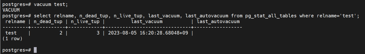 Vauum test를 수행하였지만 n_dead_tup 값이 2로 남아 있는 것을 볼 수 있다.