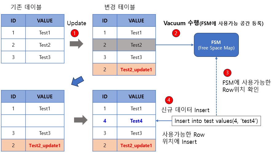 - Commit 후 AutoVacuum에 의해 변경 전 데이터가 FSM에 사용가능한 Row로 등록
