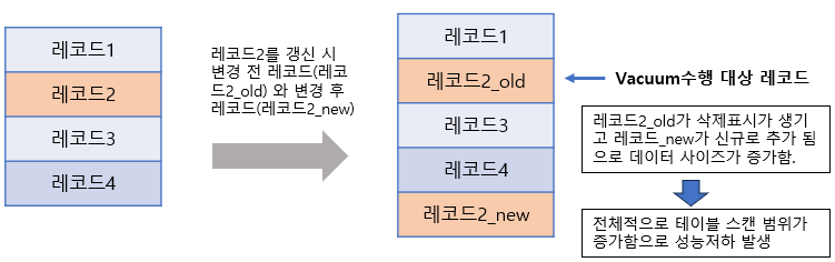 이때, 변경 전 데이터를 보관하고 Commit된 이후에도 변경 전 데이터를 참조하는 경우가 없다면 Vacuum 기능을 사용하여 변경 전 데이터를 삭제대상 데이터로 표시