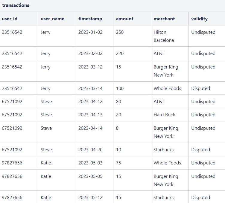 이제 데이터베이스에 질의를 수행해 볼 차례입니다. 본 포스트에서는, 다음과 같은 간단한 신용카드 결제 데이터를 이용합니다. 테이블 이름은 ‘transactions’이며, 사용자의 ID, 이름, 결제 날짜, 결제 액수, 결제 장소, 결제 승인 여부 데이터를 담고 있습니다.