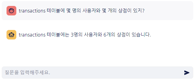 마지막으로, 답변의 형식을 지정해 준 후 사용자 입력에 따른 답변을 출력할 수 있는 함수를 구성해 주면, 자연어로 데이터베이스에 질의할 준비가 완료됩니다. ‘ask_to_AgensSQL’ 함수를 실행하면 입력창이 나타나고, 이 창에 자연어로 질문을 입력할 수 있습니다.