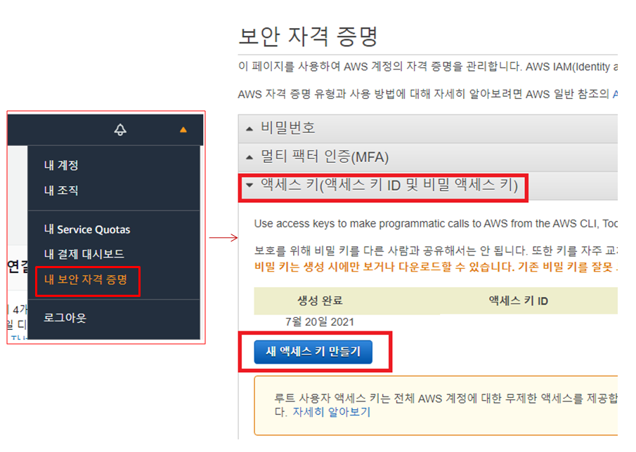 우선 AWS 로그인 후, 우상단 아이디 패널 클릭 → 내 보안 자격 증명 → 액세스 키로 이동하여 새 엑세스 키를 발급받습니다.