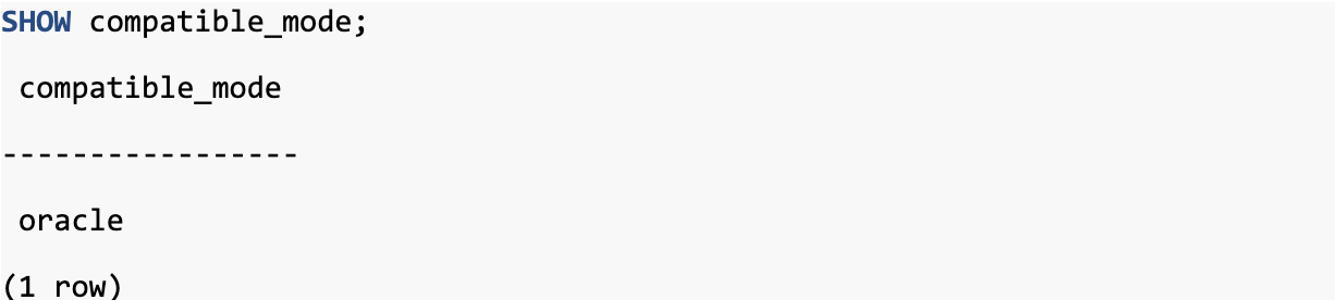 먼저 호환모드 파라미터세팅을 통하여 데이터베이스 서버의 동작을 제어하는데 아래와 같이 CLI를 통하여 Oracle로 설정하면 쿼리 출력 및 전체 시스템 동작이 변경되며 Oracle과 유사성을 갖게 된다.