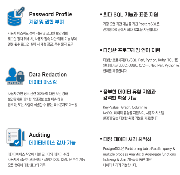 비트나인은 AgensSQL을 개발할 때 PostgreSQL의 단점을 파악하여 보고 및 감사 도구를 추가했습니다. 세 가지 보안 기능(Password Profile, Data Redaction, Auditing)이 추가되어 로그인 보안 및 사용자 개인 정보 관련 데이터 보안을 강화시키고, 데이터베이스 작업에 대한 모니터링 및 데이터 수집으로 문제가 발생하는 것을 예방할 수 있는 최적의 DBMS입니다.