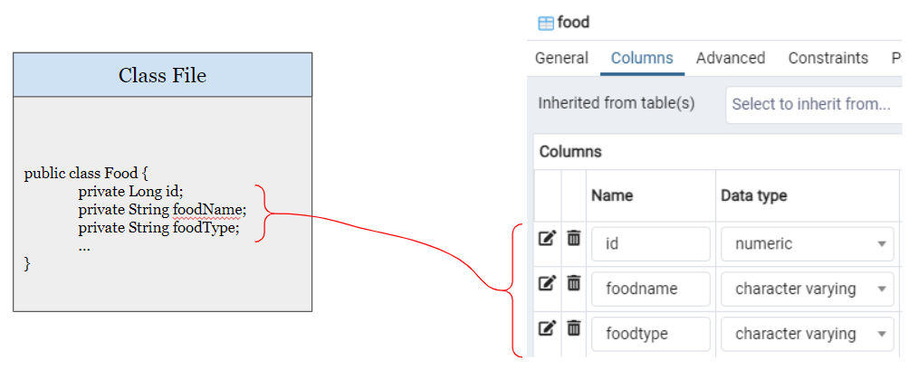 위 그림을 보시면, Class File에는 id와 foodName, foodType의 변수가 지정이 되어 있습니다. 그리고 테이블에는 id, foodname, foodtype이라는 컬럼이 지정되어 있죠. ORM을 사용하면 이 관계를 매핑하여 DB를 제어할 수 있습니다.