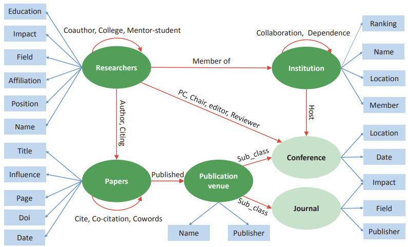 예 1) 연구자 그래프 데이터를 서로 다른 여러 속성 (키워드, 소속 학회)으로 확장하여 새로운 연구자 또는 학회 추천.