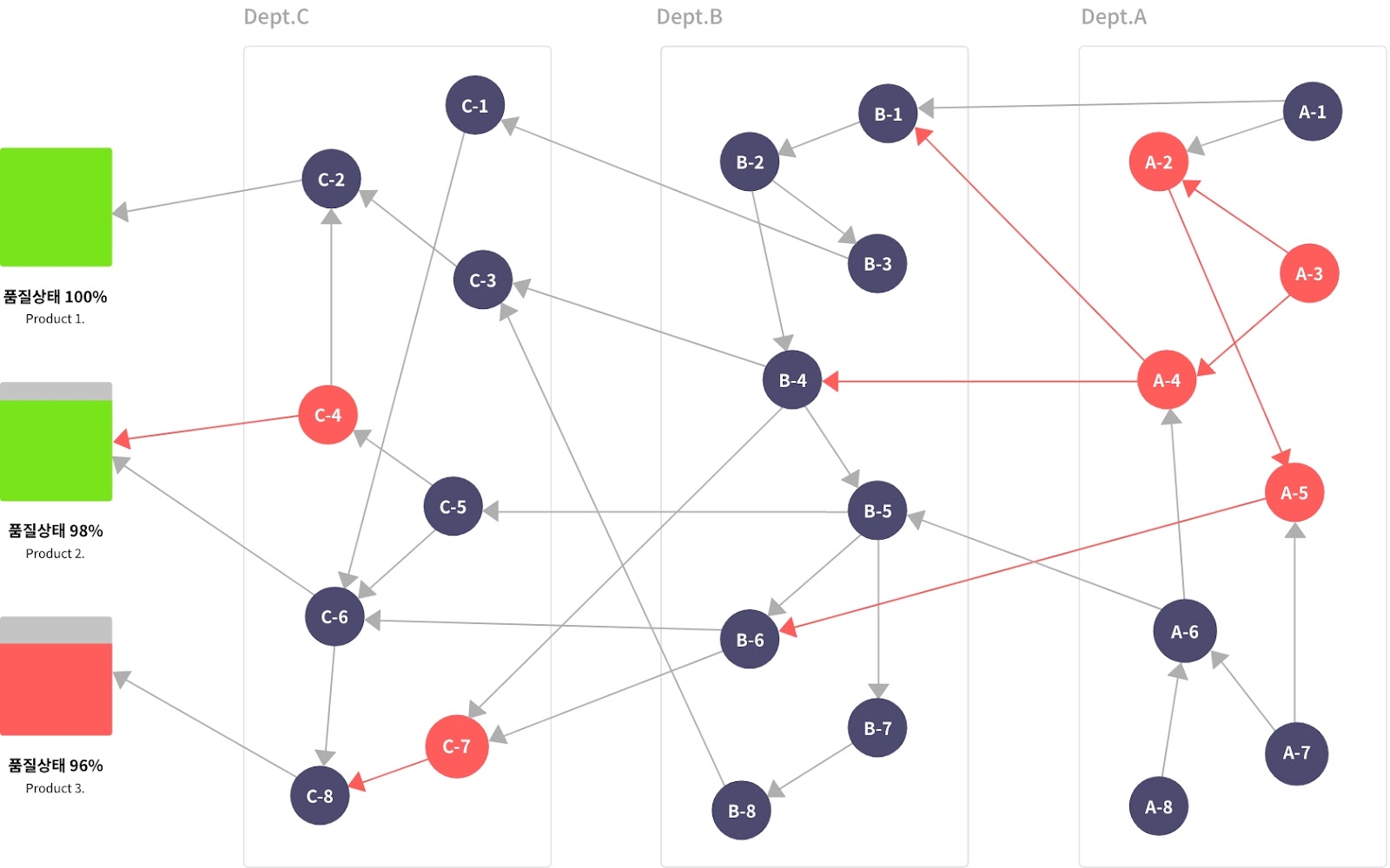 프로젝트의 목적은 해당 기업이 제품을 제조하는 과정에서 각각의 부서별로 협업관계에 따른 성과를 파악하여 조직별 효과적인 협업포인트를 발굴하고, 성과에 어떠한 영향을 미치는 지 파악하는 것이 목적이었습니다. 비트나인은 이와 같은 협업 및 관리시스템을 구축하기 위하여 해당 기업의 각 부서별로 파편화된 여러 데이터들을 표준화하였고, 이를 AgensGraph를 통하여 그래프 데이터 모델로 저장하였습니다.