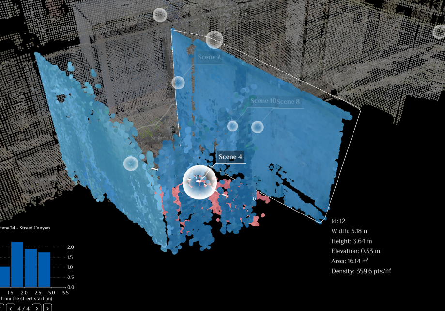 해당 사례는 브라질의 Rocinha라는 빈민촌 지형을 3D Scanning하여 도시 외곽을 따라 인구 밀집도의 데이터들을 배치한 시각화 사례입니다. 특정 공간에 따라 밀집도가 높을수록 붉은색으로 표현되며, 노드의 간격도 더 촘촘하게 배치되어 직관적으로 인구 밀집 현황을 파악할 수 있습니다. 또한 특정 거리(지역)를 클릭하면 화면의 가장자리에 디테일한 정보를 파악할 수 있는 막대차트를 함께 제공하여 사용자 입장에서 해당 공간을 더욱 심층적으로 바라볼 수 있습니다.