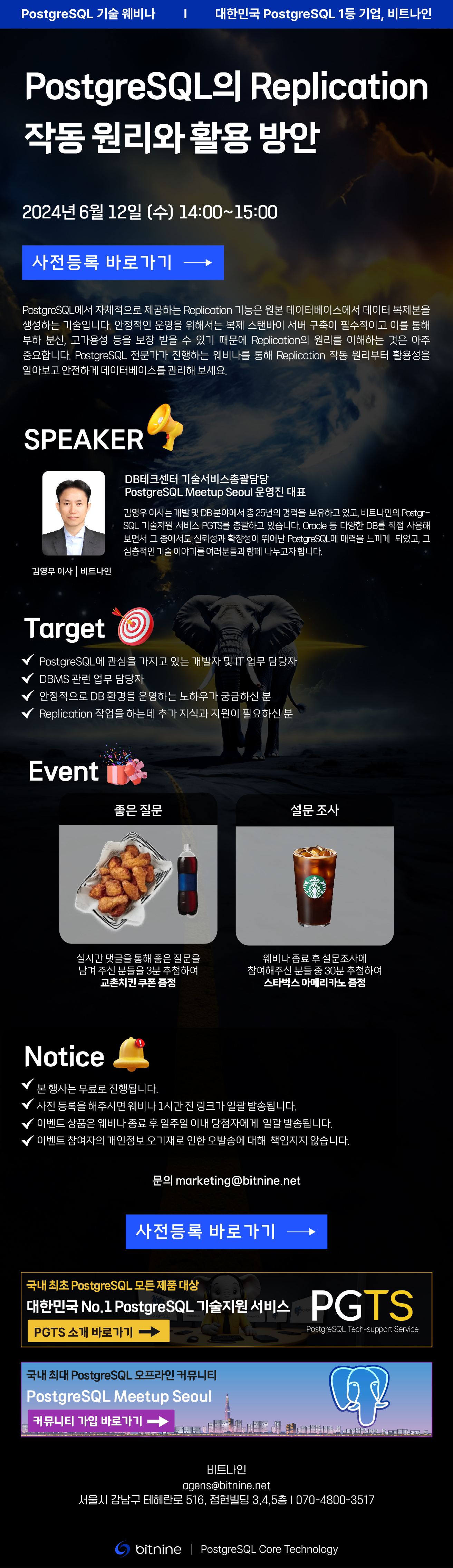 | 6/26(수) 오후 2시, 두 번째 "비트나인 PostgreSQL 기술 웨비나"에 초대합니다. (1) | 2024.06.20 |