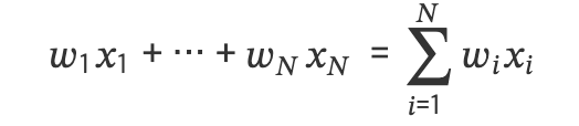 이러한 벡터의 내적(Dot Product)연산은 데이터 분석에서 사용되는 가중합(weighted sum)에서 사용됩니다. 예를 들어 만약 데이터 벡터가 𝑥=[𝑥1,⋯,𝑥𝑁]𝑇 이고 가중치 벡터가 𝑤=[𝑤1,⋯,𝑤𝑁]𝑇 이면 데이터 벡터의 가중합을 수식으로 표현하면 다음과 같습니다: