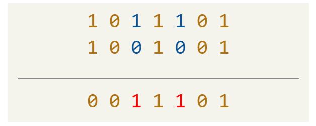 '1011101'과 '1001001'사이의 해밍 거리는 2이다. (1011101, 1001001)
