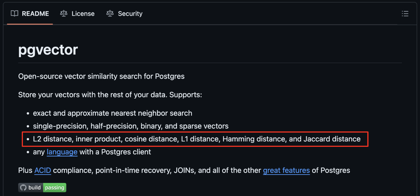 등이 있으며, 벡터 데이터베이스에서 사용자의 쿼리를 받으면 인덱스 벡터를 쿼리 벡터와 비교하여 가장 가까운(유사한) 벡터를 결정하기 위하여 위와 같은 유사도 측정법들이 사용됩니다. 개념적으로 이해하는것이 중요합니다. 아래 이미지는 앞으로 다룰 오픈소스 데이터베이스 PostgreSQL의 벡터 익스텐션인 pgvector의 Github에 주요 기능 중 지원되는 유사도 측정법을 보여줍니다. 위에 나열한 측정법들과 매칭되는 것들도 보입니다.
