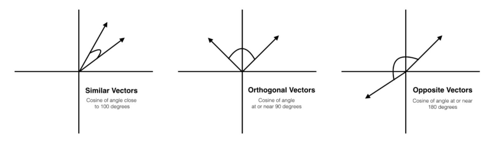 여기서 Norm ||x||와 ||y||는 위의 유클리드 거리에서도 논한바와 같이 벡터 x와 y의 크기(길이)입니다. 코사인 유사도의 범위는 -1에서 1까지이며, 1은 동일한 방향(0°), 0은 직교(90°), 그리고 -1은 반대 방향(180°)을 나타냅니다.