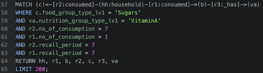 그래프 데이터베이스 모델링으로 표현한 위 시나리오와는 별개로 다른 인사이트를 찾아낼 수도 있습니다. WFP는 지원금을 받는 가정 중에서 영양성분이 함유된 식품을 제대로 챙기지 않는 경우도 많을것이라 추측했습니다. 다음의 두 쿼리는 지원금을 영양 성분의 함유와는 무관하게 엉뚱한 곳에 사용하는 가정들을 찾아내기 위한 과정에 대해 설명합니다.