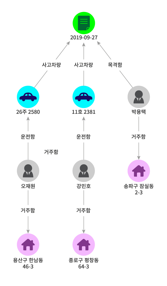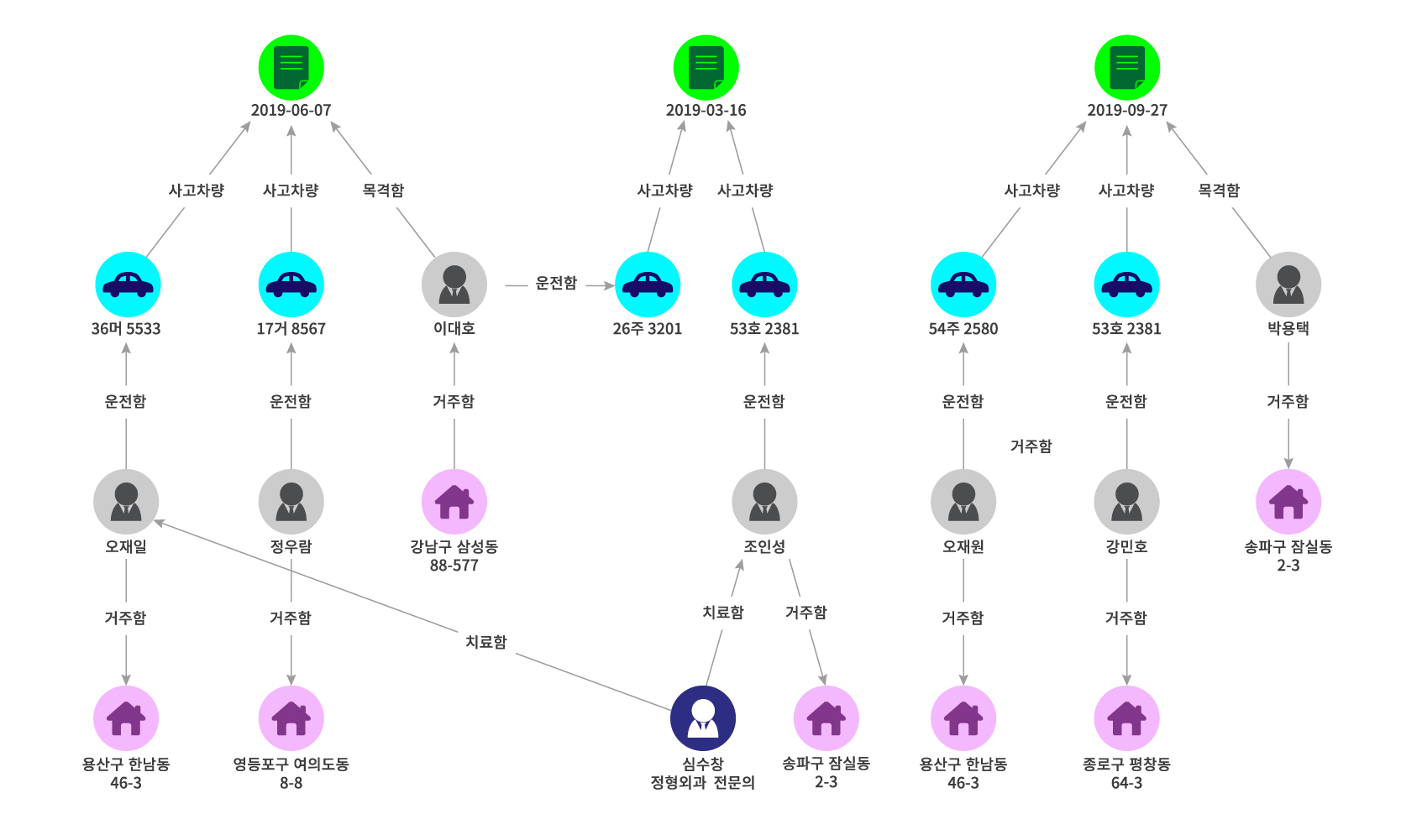 그래프 DB에 적재한 위 보험금 청구 폴더에는 하나의 사건(2019-09-27)에 대한 3명의 관련자(오재원,강민호,박용택)와 각각의 개별 거주지 및 차량에 대한 정보가 있습니다.