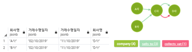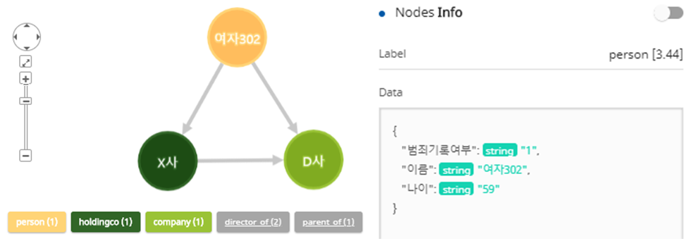 부정환급 데이터를 바탕으로 하여 회사의 정보와 관계를 그래프로 연결하였고 원하는 관점에서 조회를 할 수 있었다. 신생 회사 간의 거래 관계를 파악하고 부정환급이 의심되는 회사를 색출하였고 관련된 정보를 확인하여 모회사 / 대표의 관계를 통해 의심 정황을 포착할 수 있었다.
