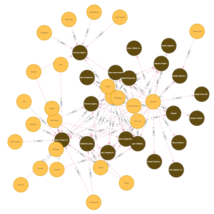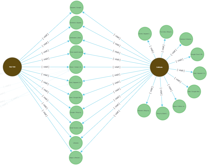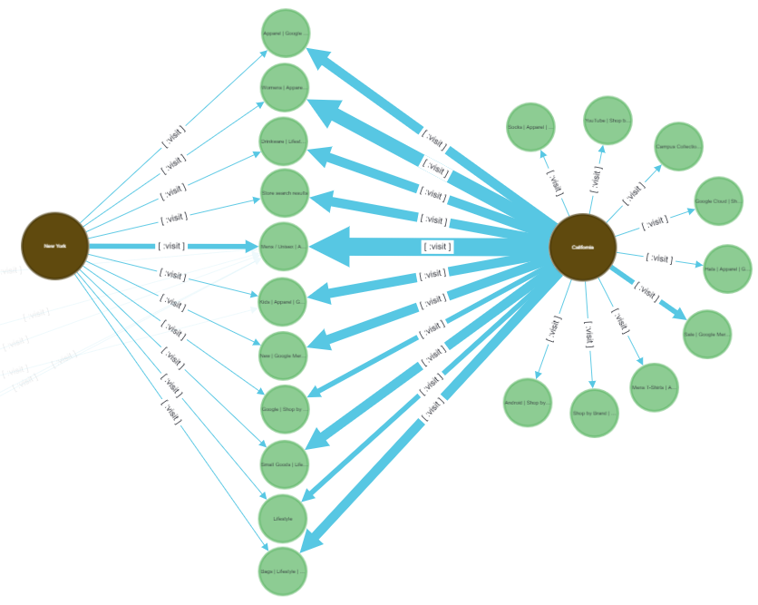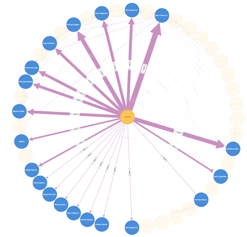 AG Cloud Express는 아직 개발 초기 단계이지만, AGViewer 덕분에 여러 노드 간의 관계를 찾거나, 테이블에 있던 속성값을 노드 또는 엣지에 입력하는 등 여러 기본 기능을 수행할 수 있습니다. 엣지에 마우스를 갖다 대면 속성값을 볼 수 있는데(데이터 모델링에 따라 다를 수 있음), 예를 들어 캘리포니아와 mens / unisex 사이의 엣지를 보면 event total 값(방문 수)이 14,232임을 알 수 있습니다. 이는 캘리포니아와 해당 항목의 페이지의 방문 수가 14,232건 발생했다는 것을 의미합니다.