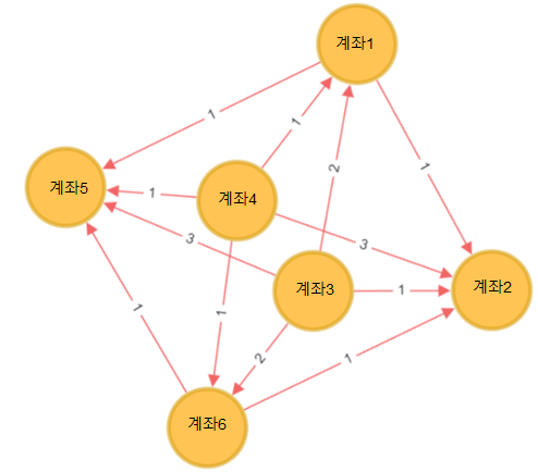 그림처럼 계좌와 계좌간의 Edge의 모델링이 가능하며, 이렇게 이분 그래프를 단일 그래프로 변환하는 과정을 Graph Projection이라고 합니다.