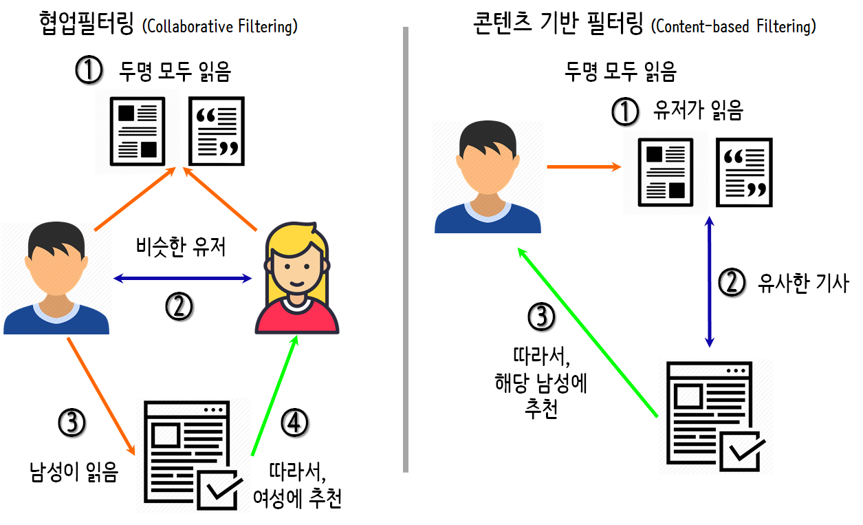 협업 필터링(Collaborative Filtering)은 사용자의 데이터를 활용해 추천해주는 만큼 상품이나 서비스 이용 또는 구매로 이어질 확률도 높습니다. 게다가 사용자가 많아질수록 데이터가 쌓여 추천 정확도와 신뢰도 또한 증가합니다. 반면에 사용자의 데이터가 없다면 추천이 어렵습니다. 신규 사용자의 경우 콜드 스타트의 이슈가 있으며, 사용자가 많아질수록 추천 계산시간이 오래 걸립니다.