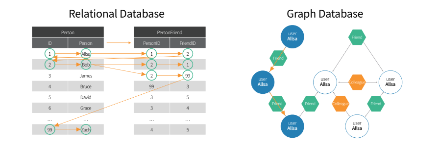 기존 관계형 데이터베이스는 별도의 테이블에 저장된 데이터의 관계를 나타내기 위해 조인(join) 방식을 사용하는 반면, 그래프 DB는 직접적으로 데이터 간의 관계를 생성하고, 생성된 데이터 간의 관계를 횡단하며 필요한 데이터를 조회합니다.