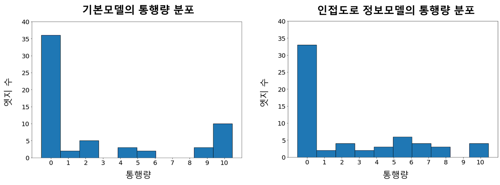 그림 4의 시뮬레이션에서 기본 모델을 나타내는 보조 그림과 비교하면 정체 구간이 확연하게 줄어들었다. 그림 5의 통행량 9~10 부분을 통해서 수치상으로 확인했다. 정체 상황을 뜻할 수 있는 통행량이 9 이상인 엣지들의 수가 기본 모델보다 줄어든 것을 확인할 수 있다.