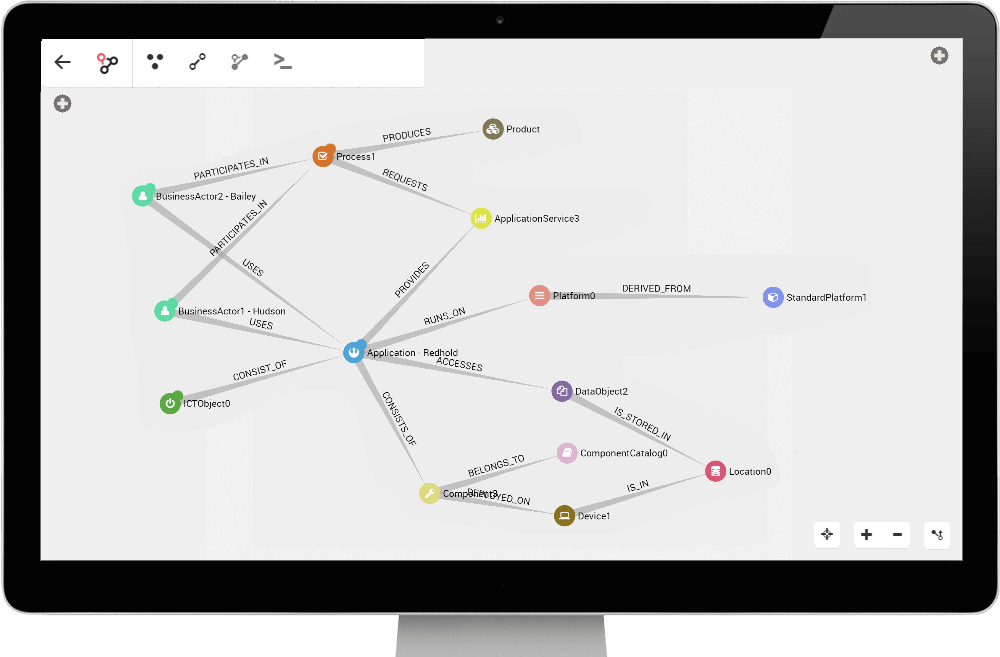 수많은 글로벌 조직이 엔터프라이즈 아키텍처 관리를 구현합니다. 이들의 목표는 비즈니스 프로세스, 애플리케이션, 데이터 환경과 인프라를 분석, 계획하여 조직이 혁신을 이룰 수 있도록 합니다. 이때 그래프 시각화를 통해 조직 자산과 그에 따른 종속 관계들을 시각화하여 영향도를 분석하고, 통찰력을 확보하여 올바른 기업 경영의 의사 결정을 할 수 있도록 사용되고 있습니다.