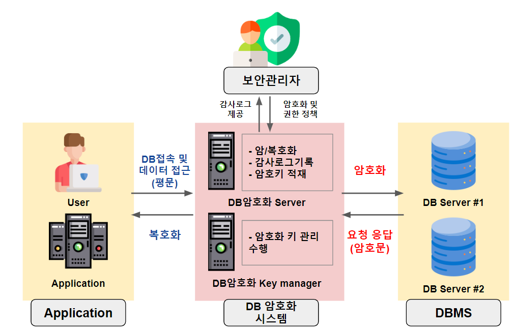 데이터베이스 암호화 시스템은 저장된 △데이터에 대한 암호화, △접근권한 설정, △암·복호화 적용, △감사 및 이력관리의 기능을 포함하며, 암호화 방식에 따라 DB서버, 애플리케이션 서버 등의 위치에서 암·복호화를 수행하고, 암호화 키를 적재, 관리합니다. 이를 통해 보안관리자는 보안 정책을 설정하고, 감사로그를 확인할 수 있습니다.