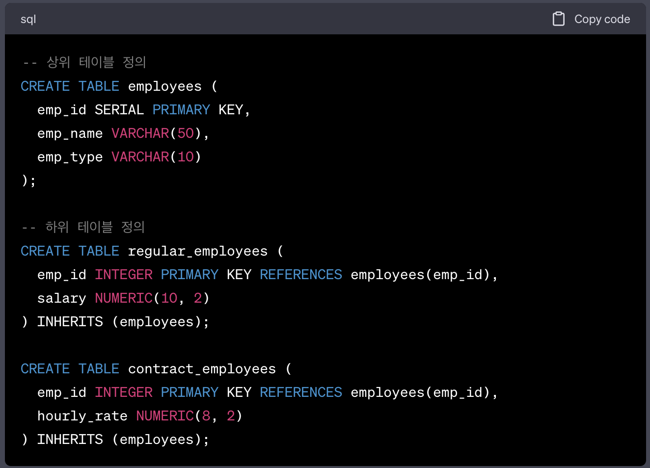 위 예제에서 employees 테이블은 모든 직원의 공통 열을 가지고 있고, regular_employees와 contract_employees 테이블은 각각 정규직과 계약직 직원들의 특정 열을 추가로 가지게 됩니다.