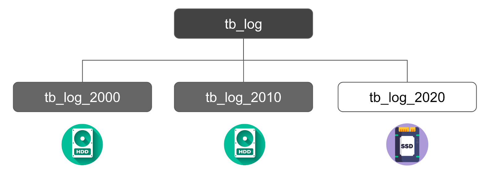 한 예로 로그를 저장한다고 하였을때 아래 구조를 활용 한다면 2000년, 2010년 데이터는 HDD로 관리하고 신규 2020년 데이터는 SSD로 관리가 가능합니다.