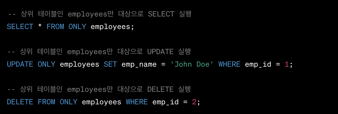 위의 예시에서 SELECT 문에서 ONLY 키워드를 사용하면 하위 테이블인 regular_employees와 contract_employees는 조회 대상에서 제외됩니다. 마찬가지로 UPDATE와 DELETE 문에서도 ONLY 키워드를 사용하면 상위 테이블에만 해당 작업이 적용됩니다.
