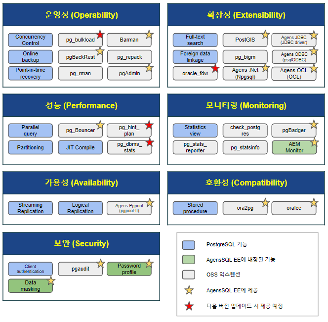 PostgreSQL 기능과 OSS 익스텐션은 아래와 같이 분류되어 있습니다.