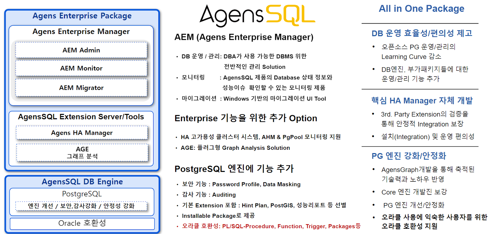 코어 레벨의 기술력을 갖춘 글로벌 R&D센터의 기술 서비스가 가능하고, 오라클 호환성, 운영 관리 도구 등을 제공하여 더 안정적이고 편리한 AgensSQL을 도입을 고려해 보시는 건 어떨까요?
