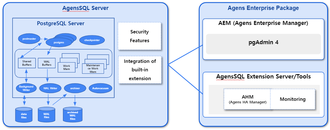 AgensSQL은 오라클 호환성, 코어 엔진 단에서의 데이터 보안 기능, 고가용성, 운영 효율을 위한 AEM(Agens Enterprise Manager), 그래프 분석을 위한 플러그인까지 강력하고 편리한 기능을 지원합니다. 다음 단락에서는 이 AgensSQL의 기능과 특장점에 대해 자세히 알아보도록 하겠습니다.