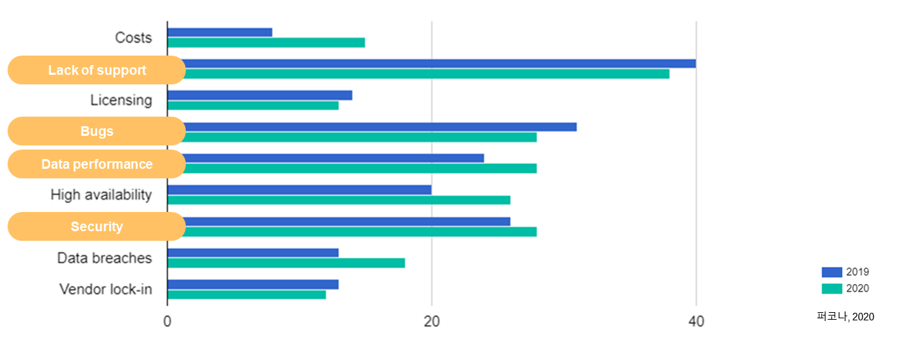 기업에서 오픈소스 데이터베이스를 도입할 때 기업이 살펴봐야 할 사항들이 몇 가지 있다. 바로 기술 지원 부족, 버그, 보안 성능 순으로 나타나고 있으며, 최근에는 기술 지원이나 버그에 대한 문제는 점점 줄어들고 있으나 보안, 데이터 성능에 대한 우려는 더 증가하는 추세이다. 아래 퍼코나의 조사자료를 보면, 기능이나 성능적인 측면에서 신뢰가 부족했던 오픈소스 DBMS가 지속 고도화되고 있음을 알 수 있다.